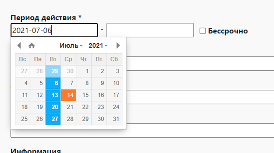 Когда заполняете период действия , вы заполняете начальную и конечную , в случае если у вас отсутствует конечная дата , нажмите на галочку Бессрочно.