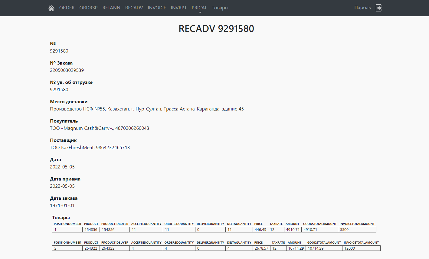 Чтобы просмотреть «Уведомление о приёмке» (RECADV), нажмите на кнопку RECADV на главной панели, ниже списком будут указаны все уведомления, где фактическая продукция была принята. Чтобы просмотреть более подробно, нажмите на номер заказа