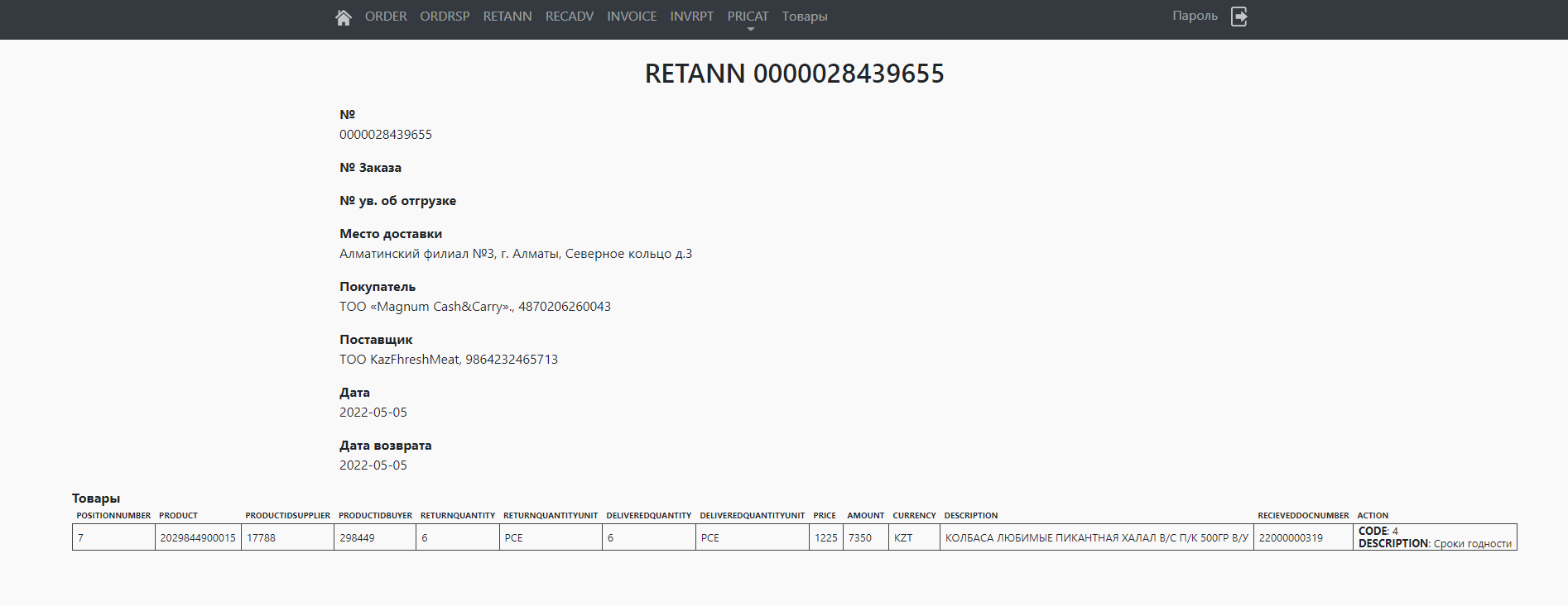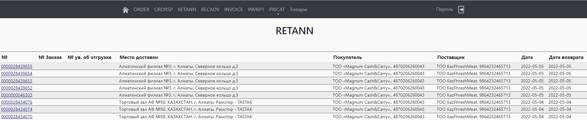 Для просмотра RETANN перейдите во вкладку «RETANN» в верхнем меню. Чтобы просмотреть более подробно, нажмите на номер заказа.